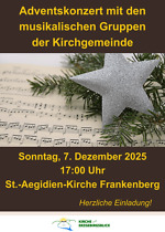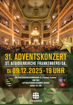 Am Dienstag, den 9. Dezember 2025 findet das traditionelle Adventskonzert in seiner nun 31. Auflage statt. Ab 19:00 Uhr stimmt das Luftwaffenmusikkorps aus Erfurt in der St.-Aegidien-Kirche Frankenberg/Sa. auf die Weihnachtszeit ein.