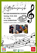 Am Sonntag, den 19.04.2026, lädt die ZeitWerkStadt von 14 bis 17 Uhr zu einem entspannten musikalischen Nachmittag ein: Kaffeehausmusik mit dem KranwerkTrio Naunhof – zum Genießen, Verweilen und Abschalten bei Kaffee und Kuchen.