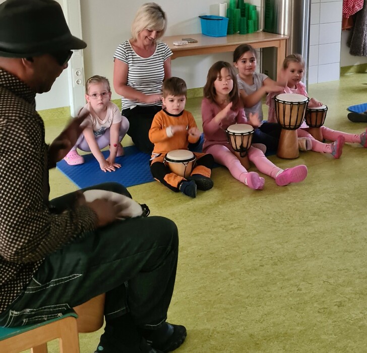 Wer in dieser Woche an unserem Kindergarten vorbei ging wird sicher die Klänge vieler Trommeln gehört haben, welche rhythmisch geschlagen wurden. Grund dafür war ein besonderer Gast, Mike aus Mosambik, der mit unseren Kindern einen tollen Trommelworkshop durchführte. Mike lebt schon seit fast 40 Jahren in Deutschland, hat hier studiert und macht Musik wie Jazz, Reggea und Blues in mehreren Bands, wo er singt und verschiedene Instrumente spielt. Er hat viel von seinem Land erzählt und die Kinder haben gelernt, das eine Trommel in Afrika auch „Telefon des Dschungels“ genannt wird, mit der man durch Trommelzeichen andere vor Gefahren warnt oder ihnen wichtige Dinge mitteilen kann. Unsere Kinder, von den kleinsten bis zu den Vorschulkindern hörten gespannt zu und waren voller Freude als die ersten Klänge unserer Trommeln erklangen. Mike zeigte den Kindern einige Takte, welche sie sofort nachmachten, erst leise und danach richtig laut. Alle Kinder hatten viel Spaß dabei, manche begannen dabei sogar zu tanzen und wer uns aus der Ferne hörte, hat bestimmt auch ein wenig das Gefühl gehabt, weit weg in einem fernen Land zu sein. Dieser Workshop war für alle eine neue und inspirierende Erfahrung und sicherlich werden wir jetzt öfter einmal zu diesem schönen Instrument greifen und uns ein wenig Afrika in unser schönes Taka-Tuka-Land holen.