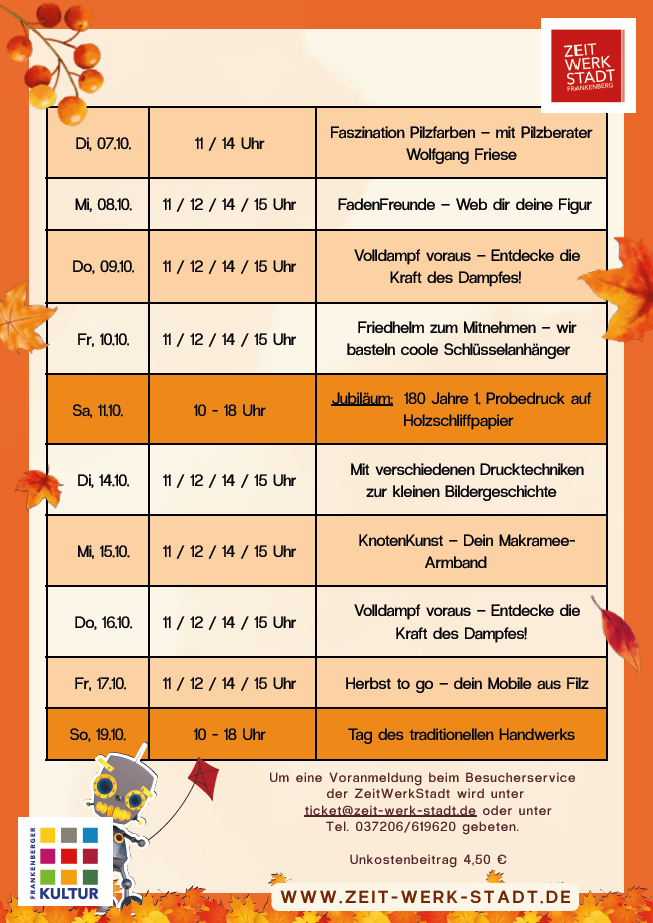 Die ZeitWerkStadt Frankenberg lädt in den Herbstferien vom 4. bis 19. Oktober 2025 zu einem abwechslungsreichen Programm für Familien und Kinder ein. Mit kreativen Workshops, Mitmachaktionen und einer spannenden Rätseljagd bietet das Museum während der schulfreien Zeit Spiel, Spaß und Wissen für kleine und große Besucher.