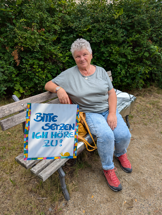 Ab Oktober 2025 wird Marion Göhzold in der Wartehalle im Haus der Vereine sitzen und sich auf Gespräche freuen. Erkennbar ist sie durch ein Schild, das zum Hinsetzen und Erzählen einlädt.