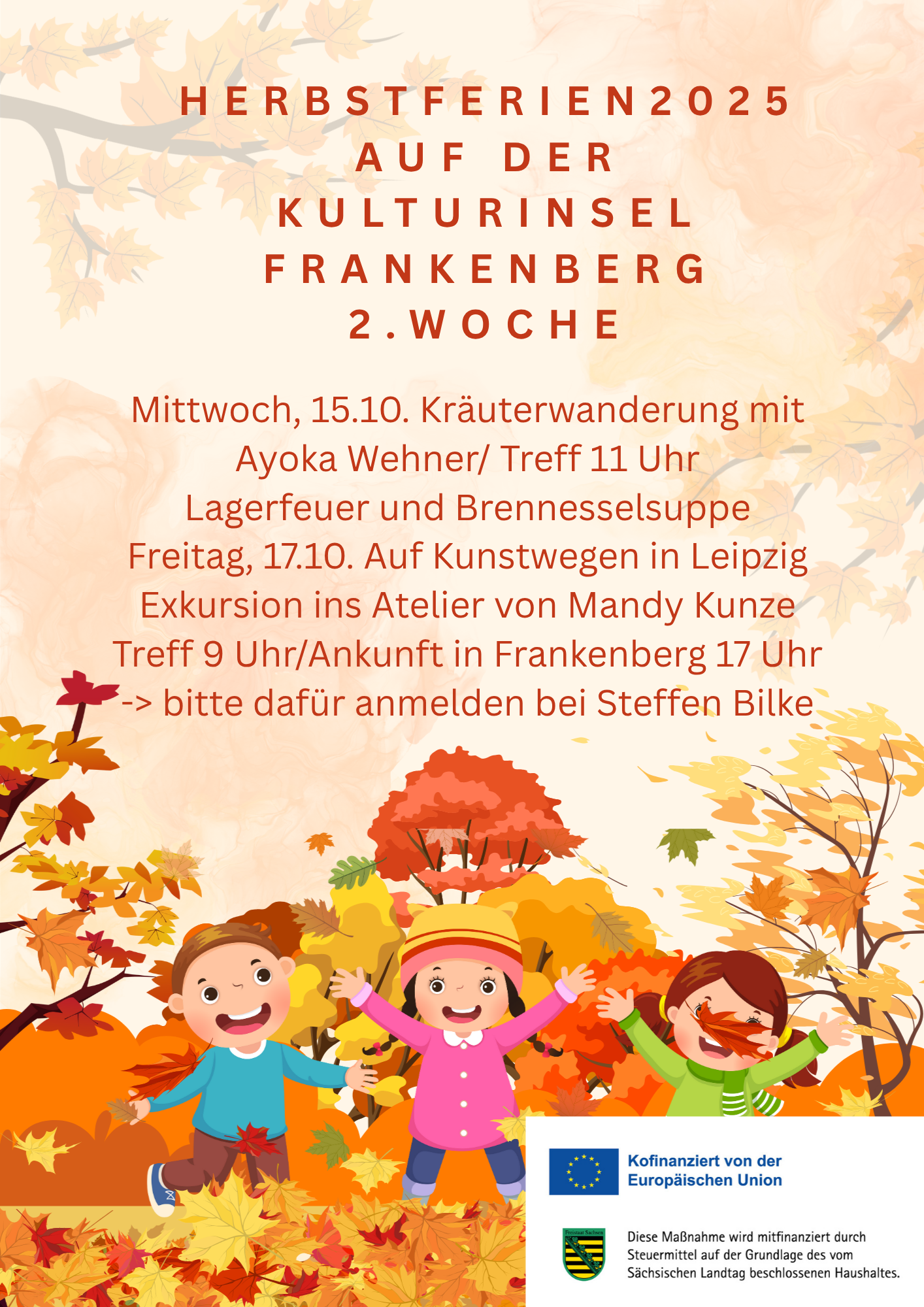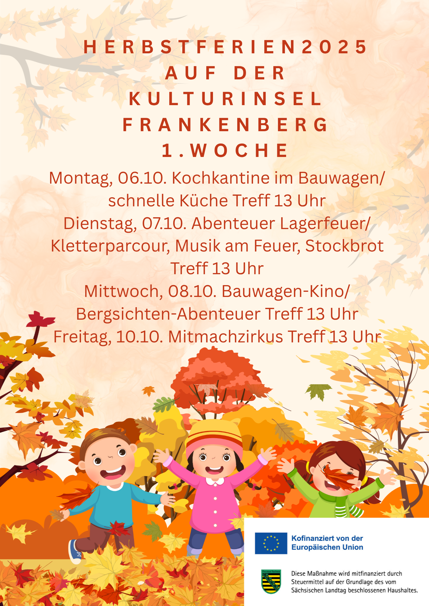 Die Kulturinsel Frankenberg/Sa., direkt neben dem Haus der Vereine, bietet ein buntes Programm in den Herbstferien. Ob Kletterparcour, Bauwagen-Kino oder Mitmachzirkus - für Kinder und Jugendliche ist jede Menge Abwechslung dabei. Auch eine kreative Exkursion sorgt dafür, dass keine Langeweile aufkommt.