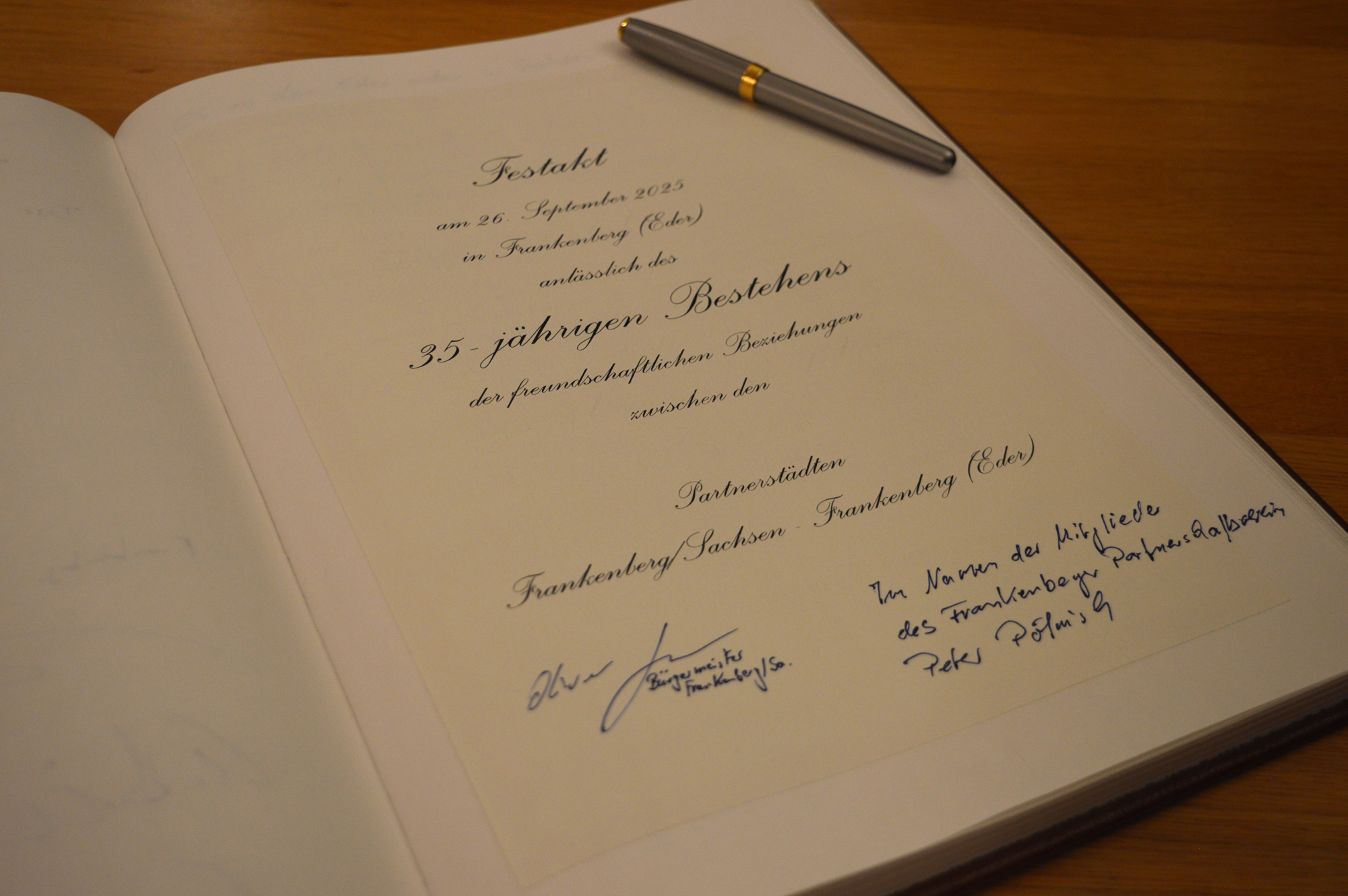 Am 26. September 2025 konnte Bürgermeister Oliver Gerstner gemeinsam mit einer kleinen Delegation der Stadtverwaltung, Vertretern aus den Stadtratsfraktionen sowie Mitgliedern des Partnerschaftsvereins in Frankenberg (Eder) das 35-jährige Bestehen unserer Städtepartnerschaft begehen. Ein kleiner Festakt erinnerte an die Anfänge dieser besonderen Verbindung und zeigte zugleich, wie lebendig und wertvoll unsere Partnerschaft auch heute noch ist.