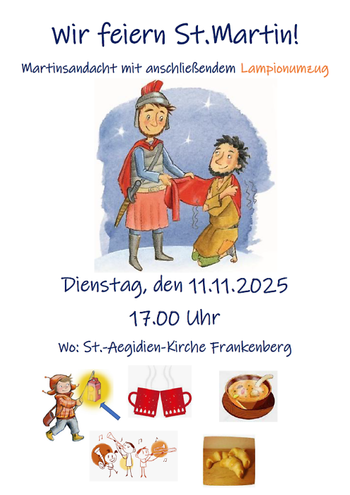 Die christliche Kindertagesstätte Pusteblume feiert St. Martin. Am Dienstag, den 11.11.2025, um 17.00 Uhr in der St.-Aegidien-Kirche Frankenberg. Alle sind herzlich eingeladen!