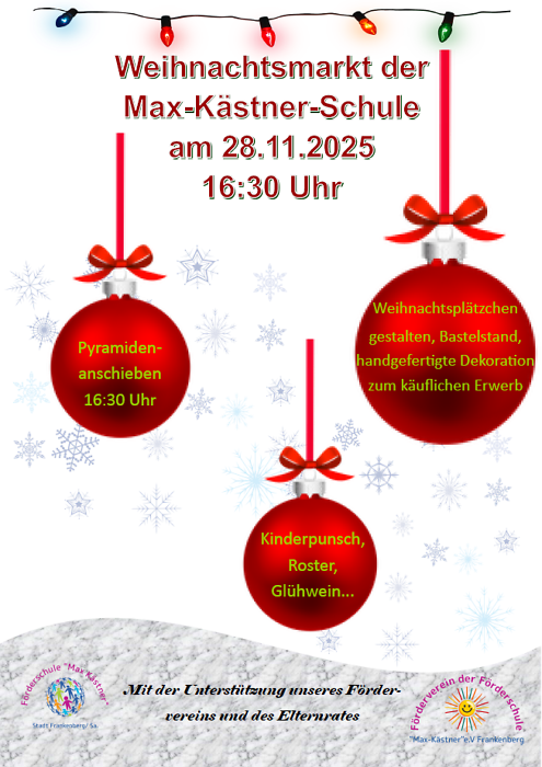 Die Förderschule "Max-Kästner" öffnet ihre Türen für den Weihnachtsmarkt am 28.11.2025 ab 16.30 Uhr. Neben Leckereien und einem Bastelangebot wird die Pyramide angeschoben. Der Weihnachtsmarkt wird mit Unterstützung des Fördervereins und des Elternrates organisiert und durchgeführt.