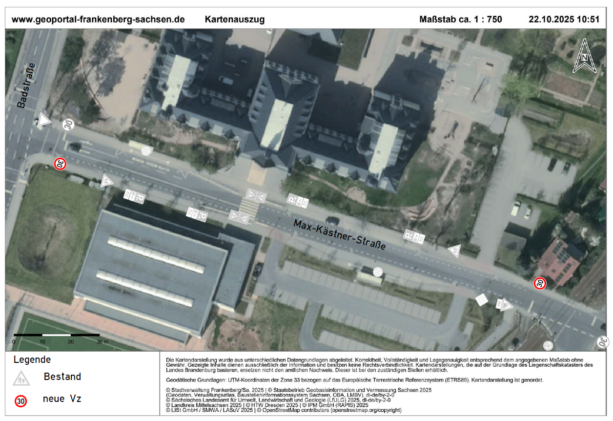 Somit ist nun auch eine streckenbezogene Geschwindigkeitsbeschränkung auf 30 km/h in Bereichen von Fußgängerüberwegen vereinfacht möglich. Dies setzt die Stadt Frankenberg/Sa. im Bereich Bildungszentrum nun um.