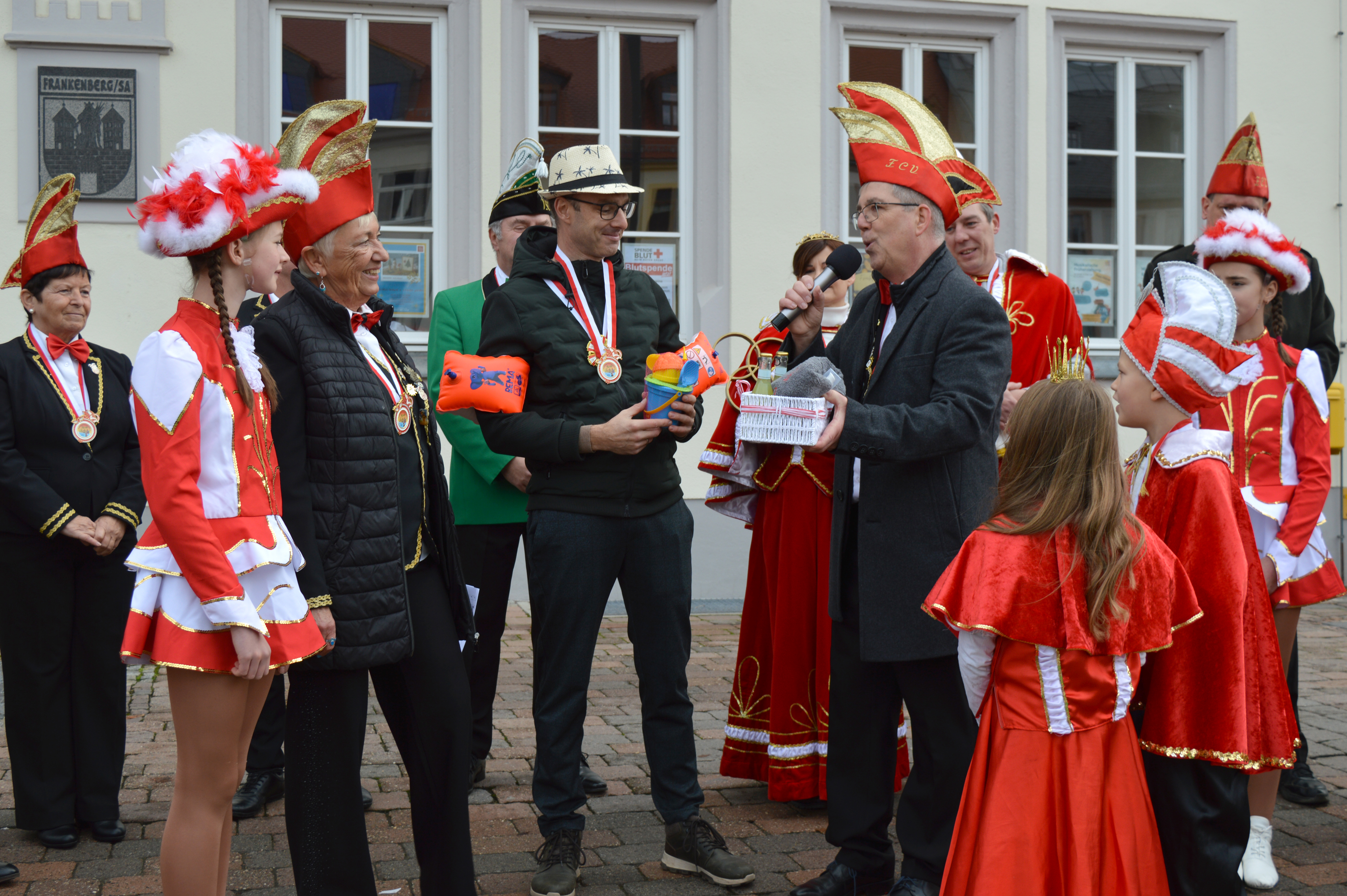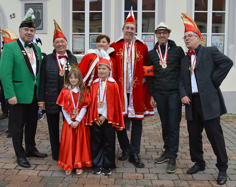 Natürlich durfte auch die traditionelle Schlüsselübergabe am Rathaus nicht fehlen. Mit einem Augenzwinkern fragte Karin Lohfink, Präsidentin des Frankenberger Carnevalsvereins: „Wir stellen nicht über 800 Fragen, das ist ja wirklich schwer zu ertragen. Eine klitzekleine Frage hätten wir doch – ist das Loch in der Stadtkasse so groß, dass wir auf unser Geld warten wieder umsonst?“
