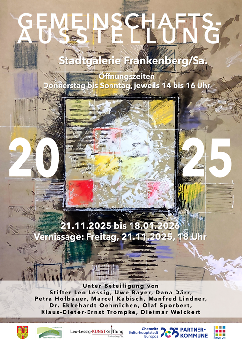 Das Ausstellungsjahr 2025 neigt sich dem Ende entgegen und wird traditionell im Rahmen der Gemeinschaftsausstellung der Leo-Lessig-KUNST-Stiftung mit den Künstlerinnen und Künstlern aus Frankenberg und Umgebung vollendet. Mit Blick auf das Finale der Kulturhauptstadt Chemnitz 2025 bietet die Stadtgalerie Frankenberg/Sa. damit erneut ein kleines Schaufenster von in der Region verankerter Kunst.