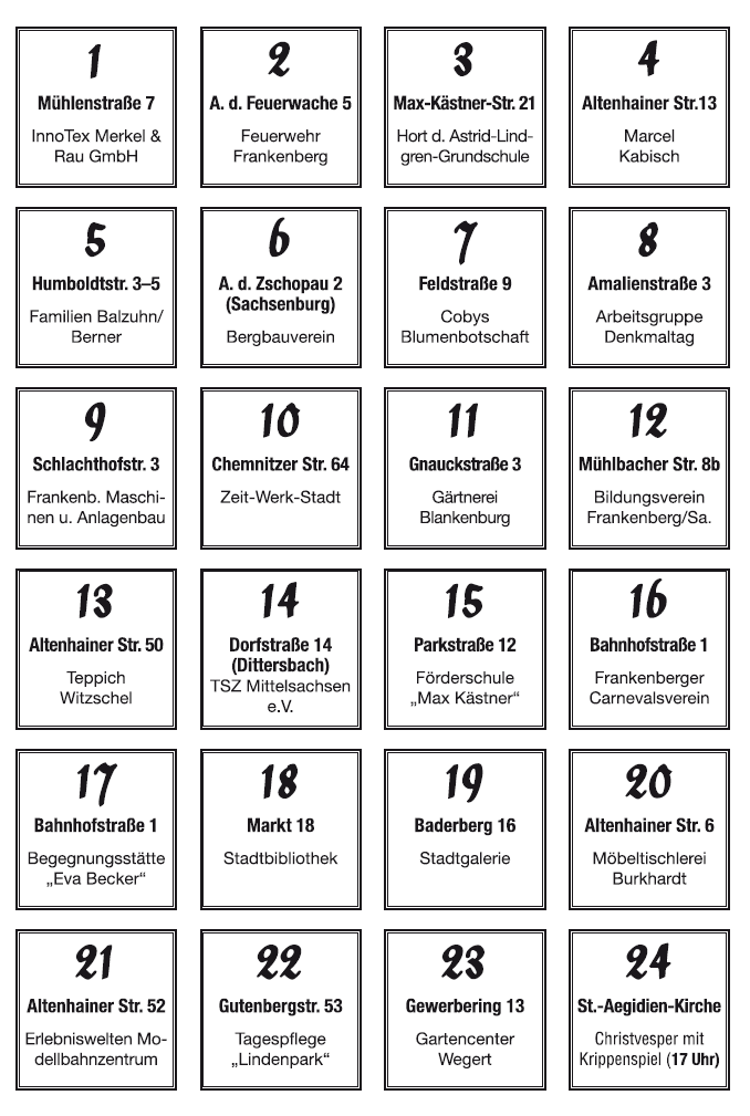 Wo die Laterne leuchtet, öffnen im Dezember 2025 Frankenberger Privat-, Geschäftsleute oder Institutionen für Sie für eine halbe Stunde von 18.30 bis 19.00 Uhr ihre Pforte und bieten Überraschendes und Kreatives rund um Kunst und Kultur in der Adventszeit. Freier Eintritt. Lassen Sie sich verzaubern!