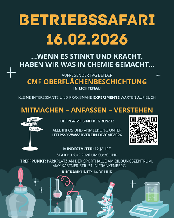 Am 16.02. bietet der Bildungsverein einen Ausflug zur CMF Oberflächentechnik GmbH in Oberlichtenau an. Hier erwarten die Kids 4 spannende Stunden mit Erkundung und kleinen interessanten und praxisnahen Experimenten.