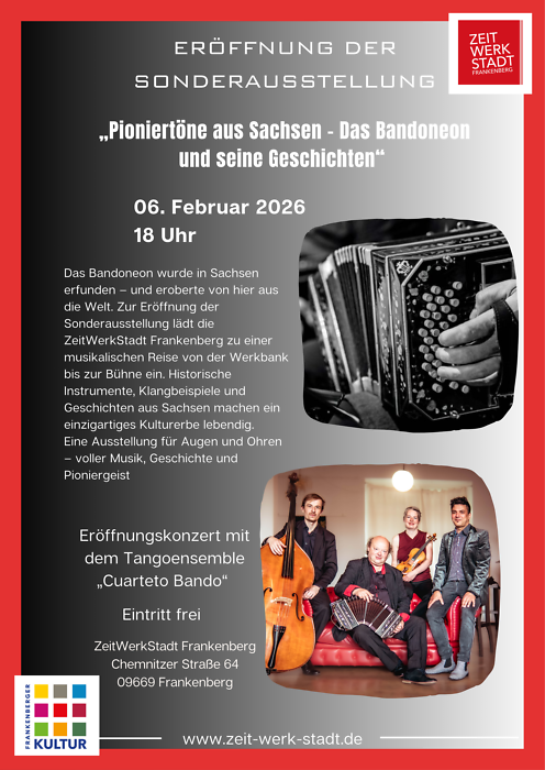 Am 6. Februar 2026, 18.00 Uhr wird im Erlebnismuseum ZeitWerkStadt eine besondere Sonderausstellung eröffnet. Rund um das Bandoneon – seine Ursprünge, seine Macher und seinen Weg bis in den argentinischen Tango.