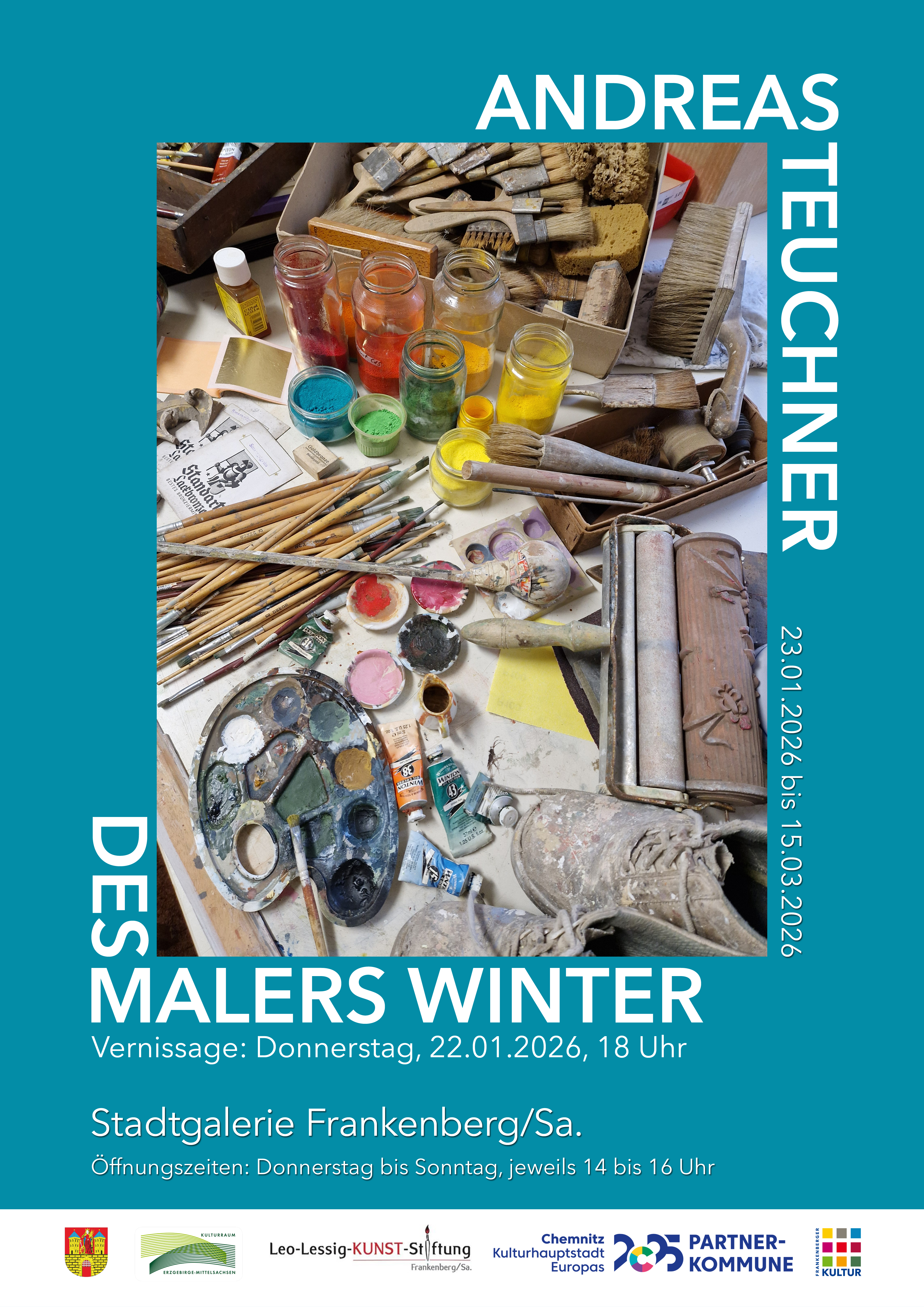 Die Ausstellung zeigt einen extravaganten Blick hinter das Handwerk des Malers in der kalten Jahreszeit unter dem Titel Andreas Teuchner: „Des Malers Winter“, der gleichzeitig einen Rückblick auf ein 100-jähriges Traditionsunternehmen in Frankenberg gewährt.